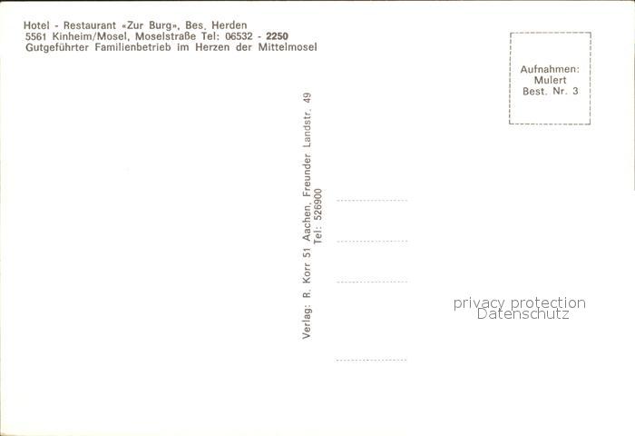 72297253 Kinheim Hotel Restaurant Zur Burg postalisch nicht gelaufen Erhaltung siehe scans KatCode: 11110007231068