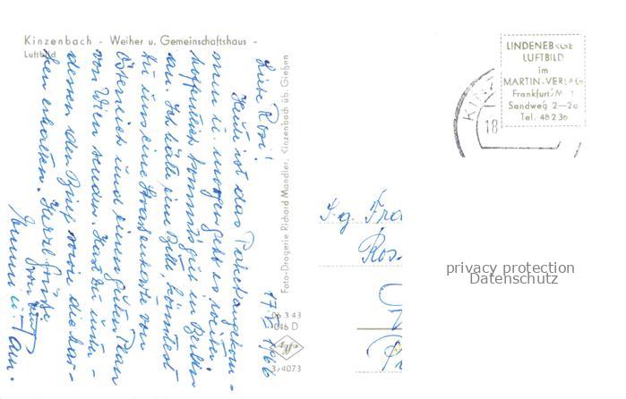 34145280 alte Postkarte Kinzenbach Heuchelheim GIEssEN Hessen Weiher und Gemeinschaftshaus postalisch gelaufen Fliegeraufnahme Erhaltung siehe scans [FriedD77] KatCode: 11110006531007