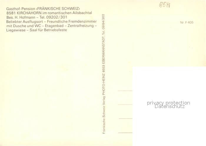 73660043 Kirchahorn Gasthof Pension Fraenkische Schweiz Panorama Ailsbachtal postalisch nicht gelaufen Erhaltung siehe scans [FriedD77] KatCode: 11110009472111