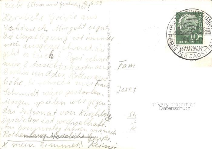72142145 alte Postkarte Kirchberg Jagst Stadtansicht Villa Schoeneck Schloss postalisch gelaufen Erhaltung siehe scans KatCode: 11110008127046