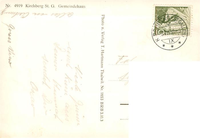 13934708 alte Postkarte Kirchberg SG Gemeinehaus postalisch gelaufen Erhaltung siehe scans [FriedD77] KatCode: 11470190585786