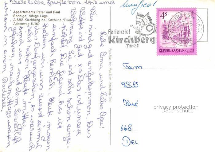 72666406 alte Postkarte Kirchberg Tirol Appartements Peter und Paul postalisch gelaufen Erhaltung siehe scans [FriedD77] KatCode: 11390335070409