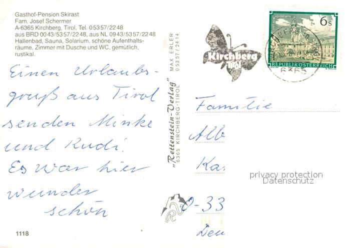 73520839 alte Postkarte Kirchberg Tirol Gasthof Pension Skirast postalisch gelaufen Erhaltung siehe scans [FriedD77] KatCode: 11390335070409