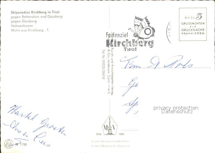 72230103 alte Postkarte Kirchberg Tirol Skiparadies gegen Rettenstein und Gaisberg Hahnenkamm Kirche postalisch gelaufen Erhaltung siehe scans KatCode: 11390335070409