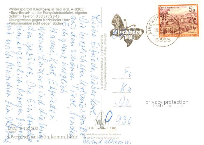 73339408 alte Postkarte Kirchberg Tirol Sporthotel an der Pengelsteinabfahrt postalisch gelaufen Erhaltung siehe scans [LiesaD40] KatCode: 11390335070409