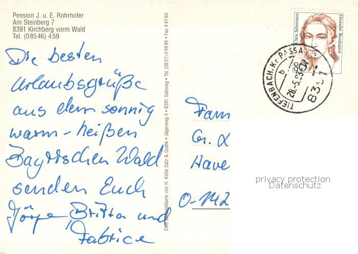 73774692 alte Postkarte Kirchberg Wald Niederbayern Pension Rohrhofer Kirche Gaststube Park Liegewiese postalisch gelaufen Erhaltung siehe scans [WerneD78] KatCode: 11110009276126
