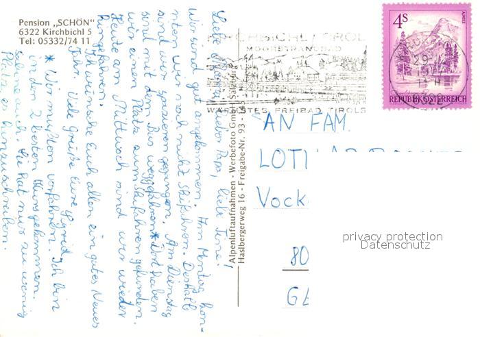 13237434 alte Postkarte Kirchbichl Tirol Pension Schoen Moorstrandbad Fliegeraufnahme postalisch gelaufen Erhaltung siehe scans [FriedD77] KatCode: 11390335070511