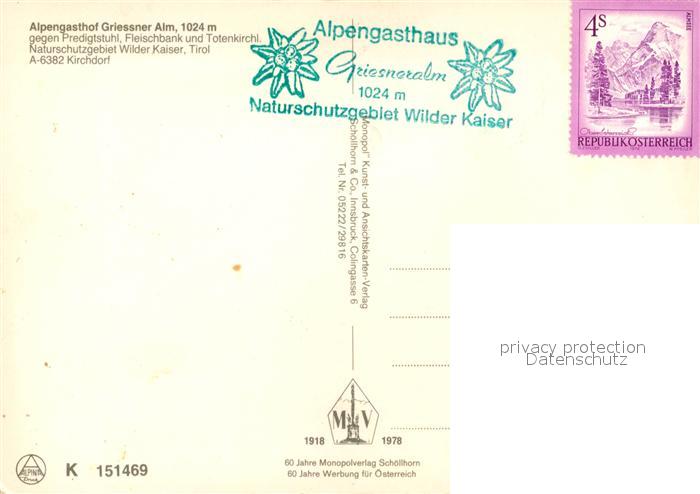 73550607 Kirchdorf Tirol Alpengasthof Griessner Alm mit Predigtstuhl Fleischbank und Totenkirchl postalisch nicht gelaufen Erhaltung siehe scans [WerneD78] KatCode: 11390335070410