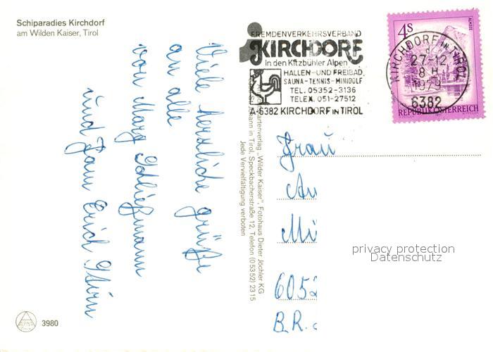 73246741 alte Postkarte Kirchdorf Tirol Schiparadies am Wilden Kaiser Hallenbad Ortsmotiv mit Kirche postalisch gelaufen Erhaltung siehe scans [FriedD77] KatCode: 11390335070410