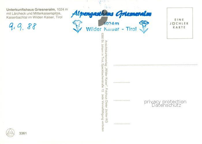 73357655 Kirchdorf Tirol Unterkunftshaus Alpengasthaus Griesneralm am Wilden Kaiser Kaisergebirge postalisch nicht gelaufen Erhaltung siehe scans [FriedD77] KatCode: 11390335070410
