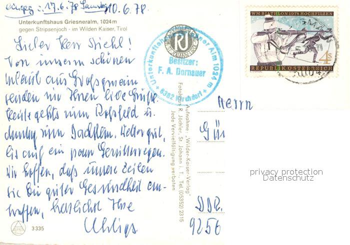 73311184 alte Postkarte Kirchdorf Tirol Unterkunftshaus Griesneralm gegen Stripsenjoch Wilder Kaiser Kaisergebirge postalisch gelaufen Erhaltung siehe scans [FriedD77] KatCode: 11390335070410