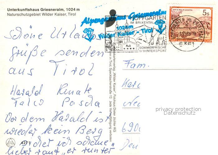73526114 alte Postkarte Kirchdorf Tirol Unterkunftshaus Griesneralm Naturschutzgebiet Wilder Kaiser Alpenflora Edelweiss Blauer Enzian postalisch gelaufen Erhaltung siehe scans [FriedD77] KatCode: 11390335070410