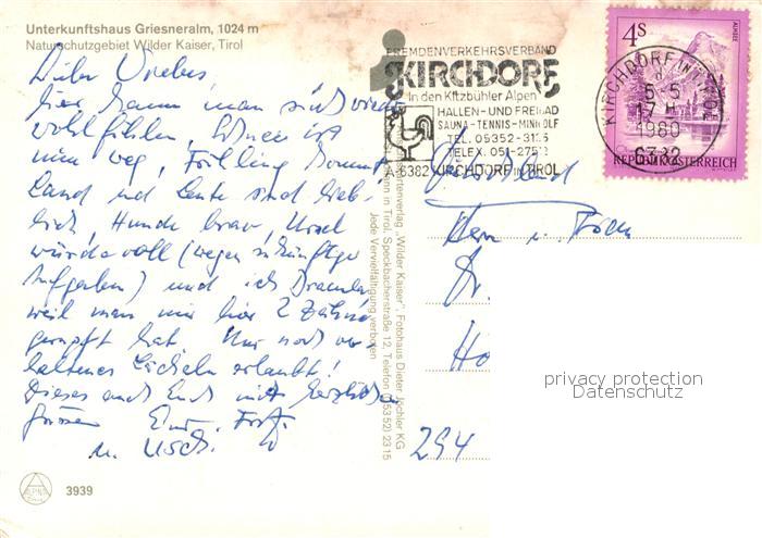 73598590 alte Postkarte Kirchdorf Tirol Unterkunftshaus Griesneralm postalisch gelaufen Erhaltung siehe scans [PaolaD17] KatCode: 11390335070410