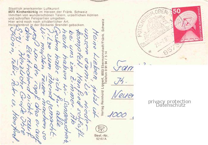 74039693 Kirchenbirkig Pottenstein Bayreuth Bayern Kirche Seepartie Panorama Holzofenbrot der Baeckerei Brendel postalisch gelaufen Erhaltung siehe scans [WerneD78] alte Postkarte Wern Katcode 11110009472179