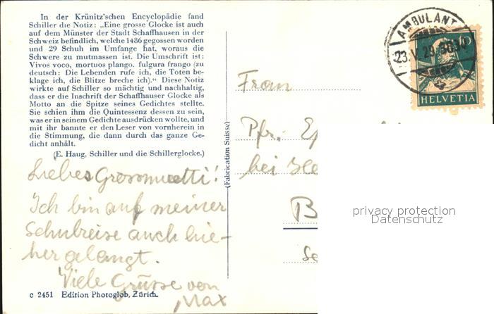 alte Postkarte Kirchenglocke Churchbell Cloche Eglise Schaffhausen Muenster Schillerglocke postalisch gelaufen Erhaltung siehe scans [PaolaD17]