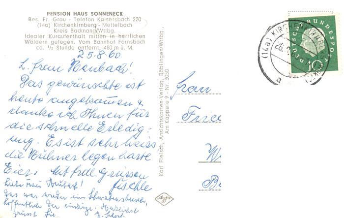 73897899 alte Postkarte Kirchenkirnberg Murrhardt Pension Haus Sonneneck Gaststube postalisch gelaufen Erhaltung siehe scans [FriedD77] KatCode: 11110008119044