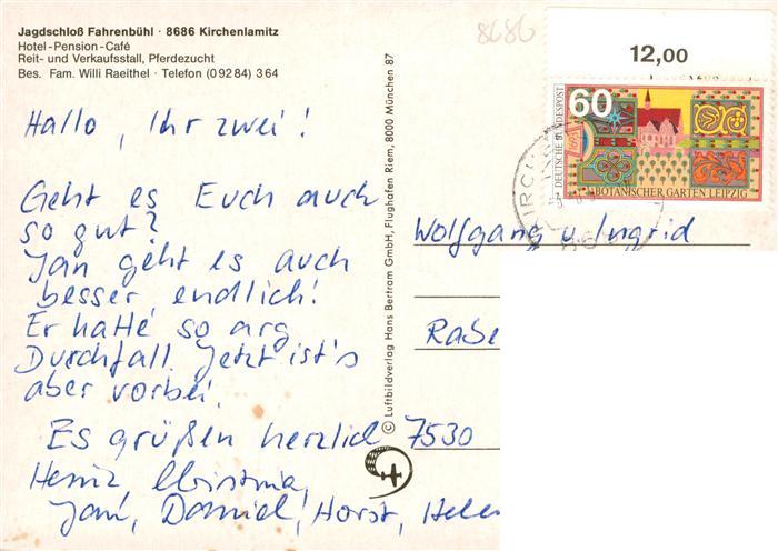 73941277 alte Postkarte Kirchenlamitz Jagdschloss Fahrenbuehl Hotel Reit- und Verkaufsstall Pferdezucht postalisch gelaufen Fliegeraufnahme Erhaltung siehe scans [FriedD77] KatCode: 11110009479129