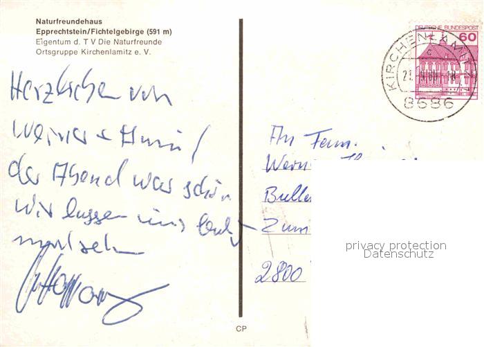 72659541 alte Postkarte Kirchenlamitz Naturfreundehaus Epprechtstein postalisch gelaufen Erhaltung siehe scans [NatalD47] KatCode: 11110009479129
