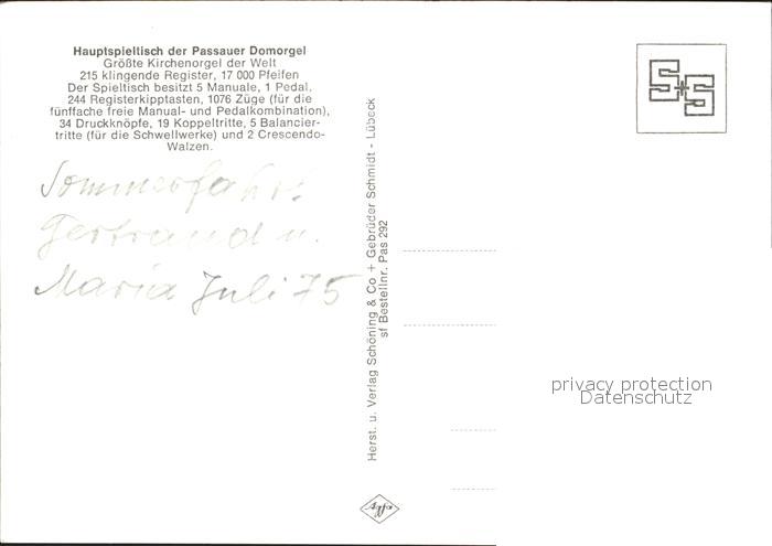 Kirchenorgel Passau Dom Hauptspieltisch postalisch nicht gelaufen Erhaltung siehe scans