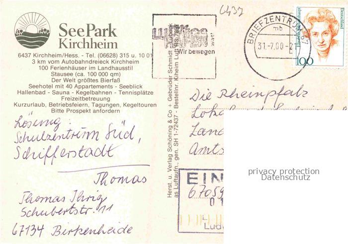 74155013 alte Postkarte Kirchheim Hessen Aulatal Hersfeld-Rotenburg Hessen Seepark Dammbruch am 22.08.1977 postalisch gelaufen Fliegeraufnahme Erhaltung siehe scans [FriedD77] KatCode: 11110006632011