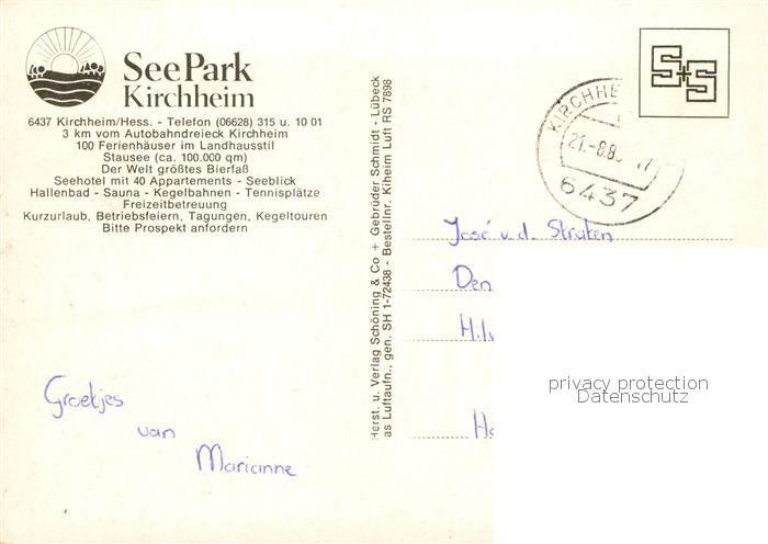 73841137 alte Postkarte Kirchheim Hessen See Park Kirchheim Fliegeraufnahme postalisch gelaufen Erhaltung siehe scans [WerneD78] KatCode: 11110006632011