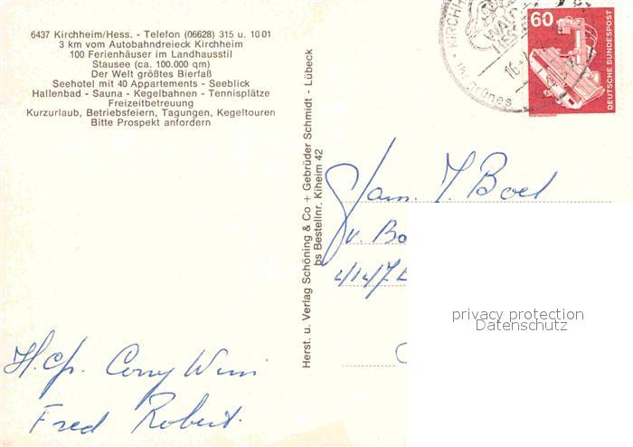 72719428 alte Postkarte Kirchheim Hessen Seepark Stausee Segeln Tennis Badestrand Tierpark postalisch gelaufen Erhaltung siehe scans [FriedD77] KatCode: 11110006632011