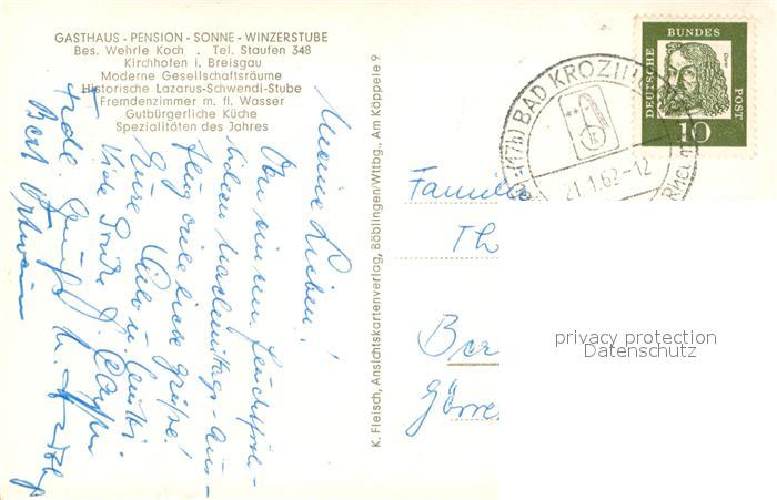 73652738 alte Postkarte Kirchhofen Breisgau Gasthaus Pension Sonne Winzerstube Kirchturm postalisch gelaufen Erhaltung siehe scans [FriedD77] KatCode: 11110008315131