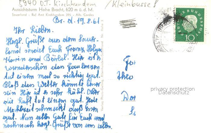 73700801 alte Postkarte Kirchhundem Aussichtsturm Hohe Bracht postalisch gelaufen Erhaltung siehe scans [FriedD77] KatCode: 11110005966016