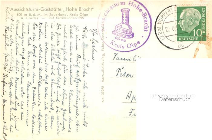 72978133 alte Postkarte Kirchhundem Hohe Bracht Aussichtsturm Berggaststaette Fliegeraufnahme postalisch gelaufen Erhaltung siehe scans [FriedD77] KatCode: 11110005966016