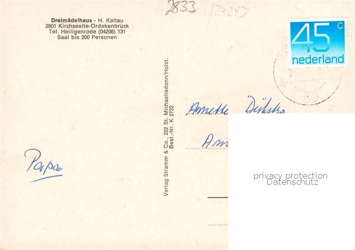 73867477 alte Postkarte Kirchseelte Drei Maedelhaus Gastraeume postalisch gelaufen Erhaltung siehe scans [WerneD78] KatCode: 11110003458011