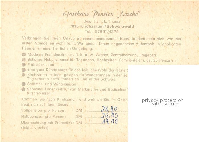 73081761 Kirchzarten Gasthaus Pension Lerche postalisch nicht gelaufen Werbekarte (keine Postkarte) Erhaltung siehe scans [LiesaD40] KatCode: 11110008315064