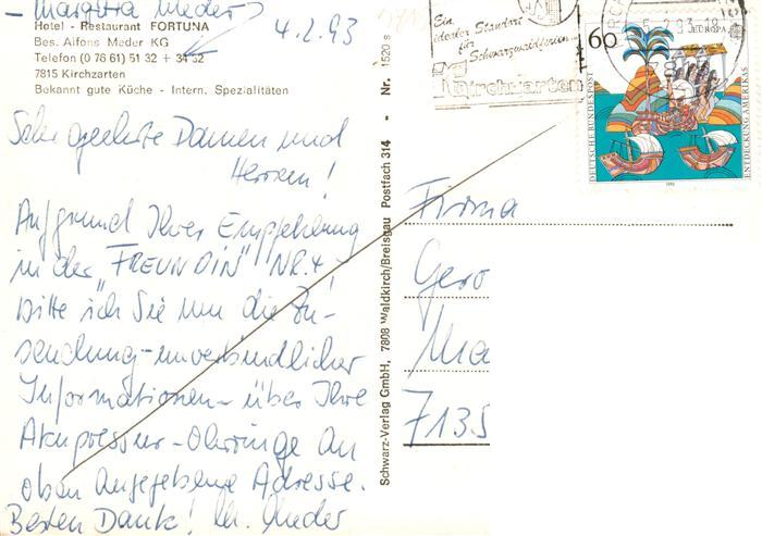73934567 alte Postkarte Kirchzarten Hotel Restaurant Fortuna Gastraum Rezeption Kegelban postalisch gelaufen Erhaltung siehe scans [WerneD78] KatCode: 11110008315064