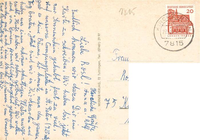 73934760 alte Postkarte Kirchzarten Panorama Kath Kirche Kurhaus Schwimmbad postalisch gelaufen Erhaltung siehe scans [WerneD78] KatCode: 11110008315064