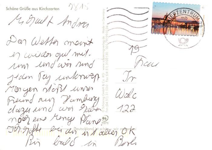73934783 alte Postkarte Kirchzarten Skulpturen Rathaus Panorama Kirche Schoss Fahnenplatz Muehle postalisch gelaufen Erhaltung siehe scans [WerneD78] KatCode: 11110008315064