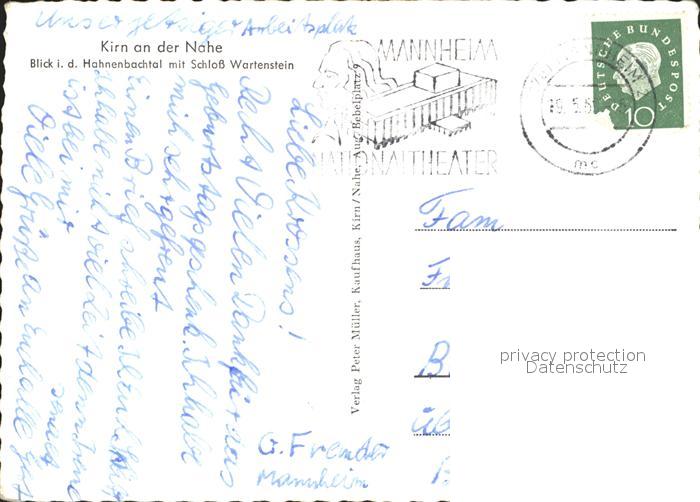 72365840 alte Postkarte Kirn Nahe Hahnenbachtal mit Schloss Wartenstein postalisch gelaufen Erhaltung siehe scans KatCode: 11110007133052