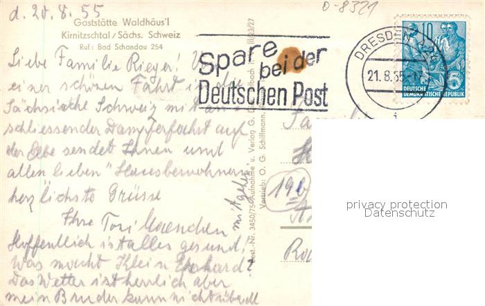 43361854 alte Postkarte Kirnitzschtal Gaststaette Waldhaeusl postalisch gelaufen Erhaltung siehe scans [WerneD78] KatCode: 11110014287180