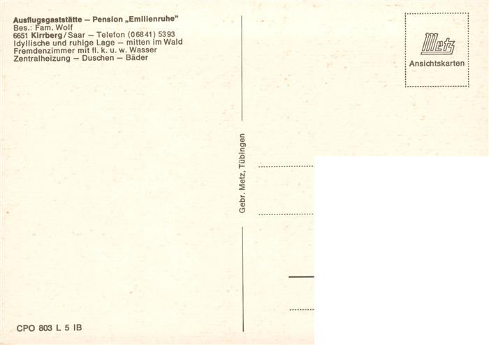 73902888 Kirrberg Homburg Saar Gaststaette Pension Emilienruhe postalisch nicht gelaufen Erhaltung siehe scans [WerneD78] KatCode: 11110010045114