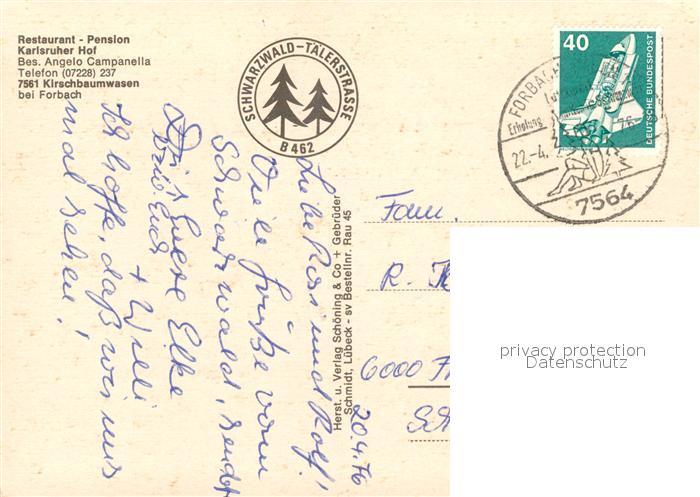 73196772 alte Postkarte Kirschbaumwasen Restaurant Karlsruher Hof postalisch gelaufen Erhaltung siehe scans [NatalD47] KatCode: 11110008216013