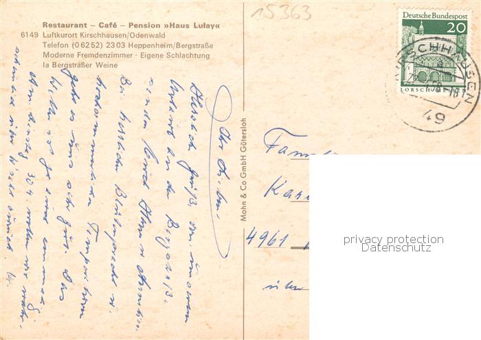 73796455 alte Postkarte Kirschhausen Restaurant Cafe Pension Haus Lulay postalisch gelaufen Erhaltung siehe scans [WerneD78] KatCode: 11110006431011