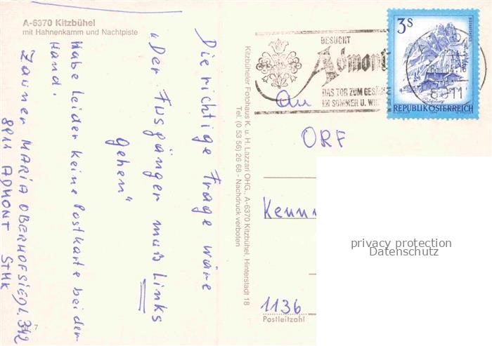 74157574 alte Postkarte Kitzbuehel Tirol AT Nachtaufnahme Hahnenkamm Nachtpiste Stadtlichter Winter Schnee Skigebiet Kirchturm postalisch gelaufen Erhaltung siehe scans [Karloger] KatCode: 11390335070411