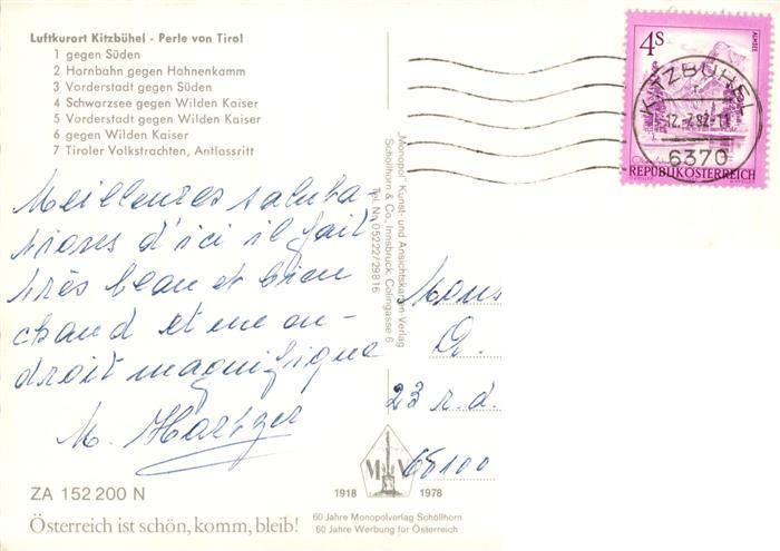 73944201 alte Postkarte Kitzbuehel Tirol AT Panorama Hornbahn Hahnenkamm Vorderstadt Schwarzsee Wilder Kaiser Tiroler Volkstrachten Antlassritt postalisch gelaufen Erhaltung siehe scans [WerneD78] KatCode: 11390335070411