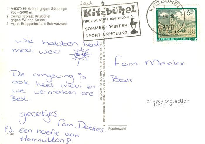 73028894 alte Postkarte Kitzbuehel Tirol Campingplatz Wilder Kaiser Hotel Bruggerhof Schwarzsee postalisch gelaufen Erhaltung siehe scans [PaolaD17] KatCode: 11390335070411