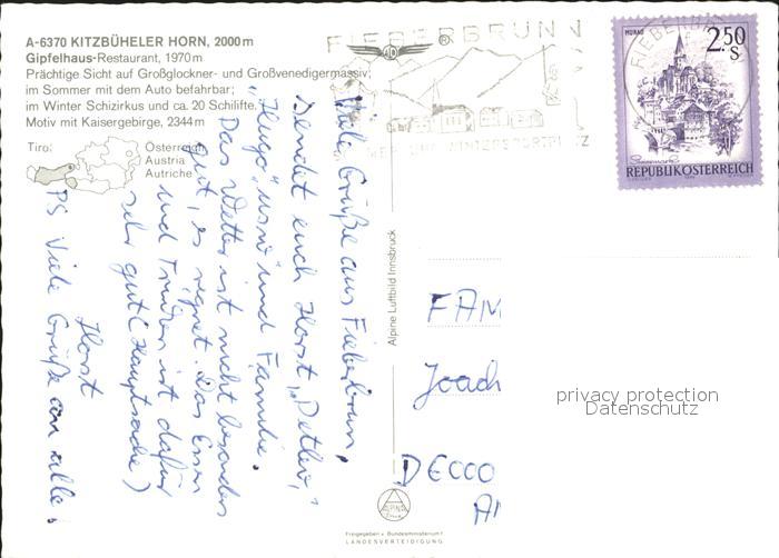 72059149 alte Postkarte Kitzbuehel Tirol Kitzbueheler Horn Gipfelhaus Restaurant Kaisergebirge Wappen Fliegeraufnahme postalisch gelaufen Erhaltung siehe scans KatCode: 11390335070411
