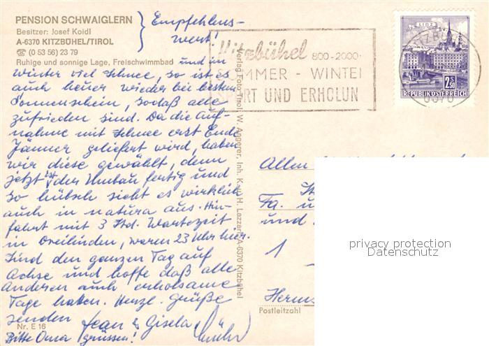 13188242 alte Postkarte Kitzbuehel Tirol Pension Schwaiglern postalisch gelaufen Erhaltung siehe scans [NatalD47] KatCode: 11390335070411