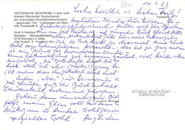 74054339 Kitzingen Main Knoll Rheinhart Weingrosskellerei Historische Weinprobe im Weinkeller der ehem Benediktinerabtei postalisch nicht gelaufen Erhaltung siehe scans [WerneD78] KatCode: 11110009675141