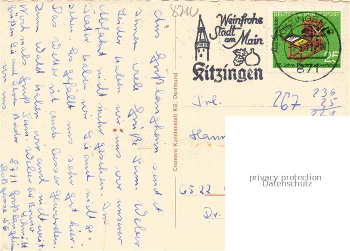 74054877 alte Postkarte Kitzingen Main Rathaus Luitpoldbad Park Falterturm Mainpartie Kirche postalisch gelaufen Erhaltung siehe scans [WerneD78] KatCode: 11110009675141