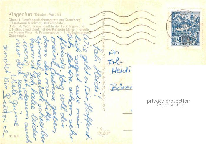 72654957 alte Postkarte Klagenfurt Woerthersee Kreuzberg Lindwurm-Denkmal Pestsaeule Denkmal-Kaiserin-Maria-Theresia Kramergasse postalisch gelaufen Erhaltung siehe scans [LiesaD40] KatCode: 11390211020101