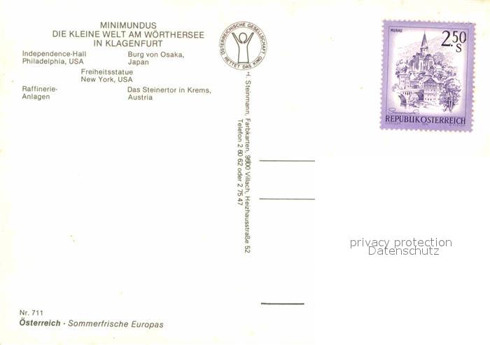 72700543 Klagenfurt Woerthersee Minimundus Independence Hall PA Freiheitsstatue Burg von Osaka Raffinerieanlagen Steinertor in Krems postalisch nicht gelaufen Erhaltung siehe scans [WerneD78] KatCode: 11390211020101