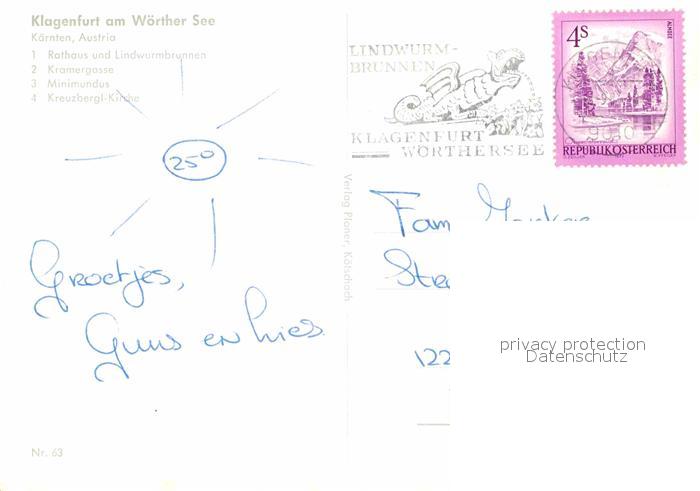 72893057 alte Postkarte Klagenfurt Woerthersee Rathaus Lindwurmbrunnen Kramergasse Minimundus postalisch gelaufen Erhaltung siehe scans [LiesaD40] KatCode: 11390211020101