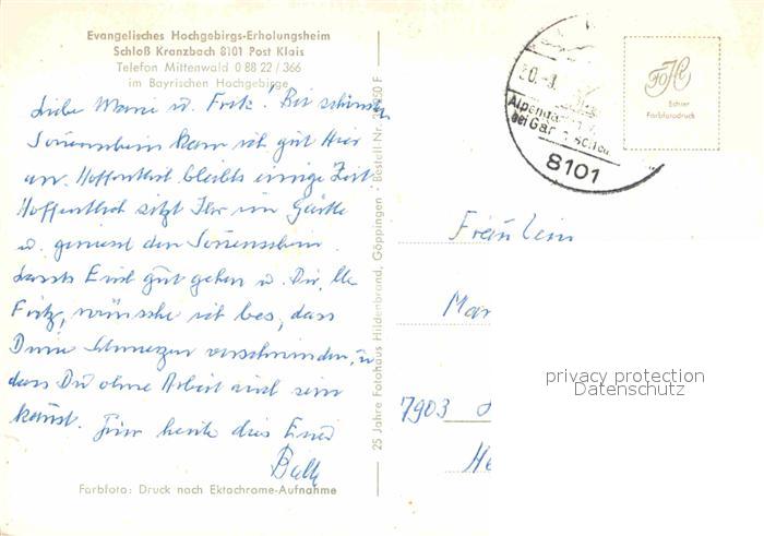 72855063 alte Postkarte Klais Evangelisches Hochgebirgs Erholungsheim Schloss Kranzbach postalisch gelaufen Erhaltung siehe scans [AndreD76] KatCode: 11110009180122